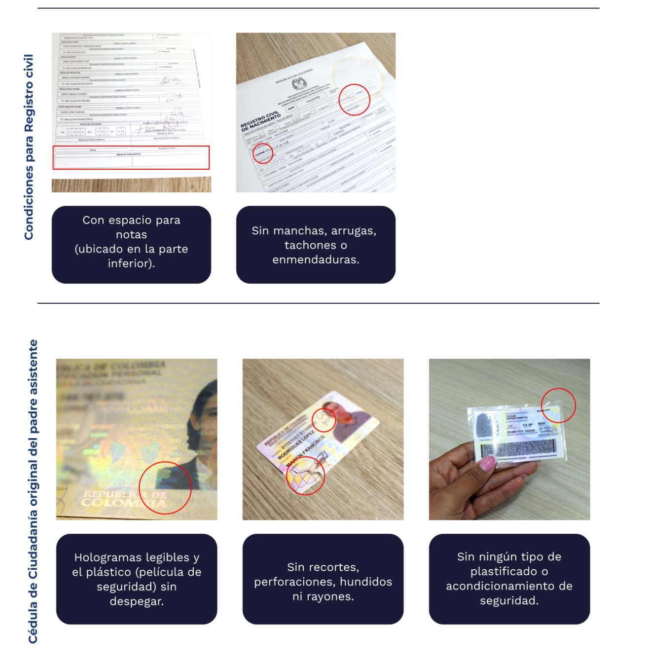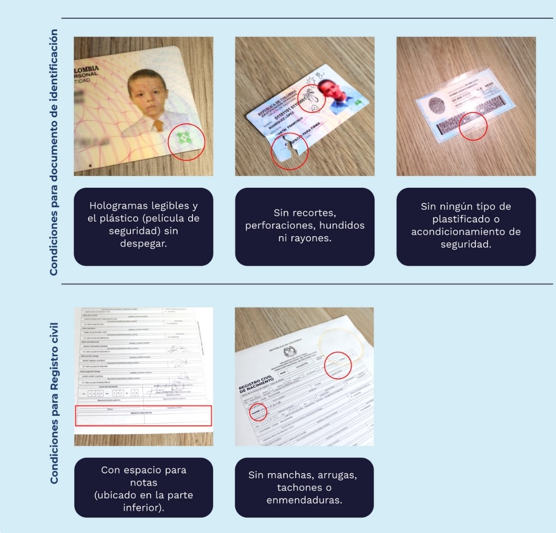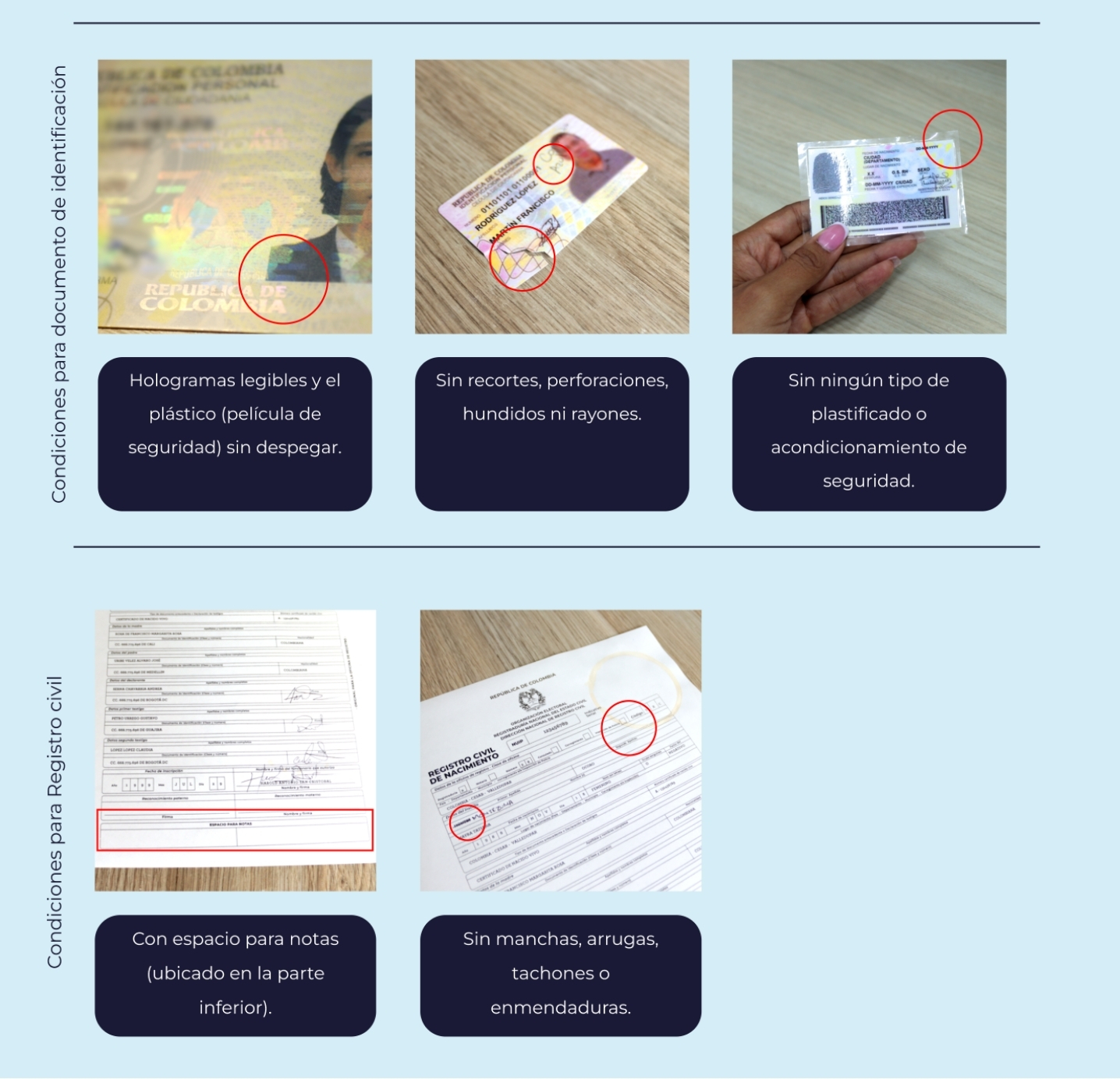 Recuerde revisar los documentos y asegurarse de que sean totalmente legibles, no presenten ningún tipo de enmendadura o ausencias de datos como números de identificación, nombres y/o nacionalidad.